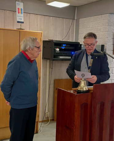 Arne Nedrelien Karlsen ble utnevnt til æresmedlem i Stokke Rotary på årets siste møte.